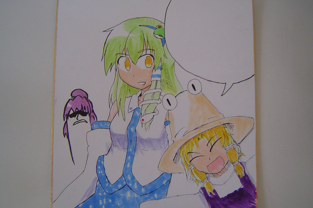 2010/03/30 Category : 日記とか 色紙 先週の水戸コミで使ったもの。吹き出しのところに告知つけてました。 会場入りしてから塗ってたのですがやはり周りも自分もせわしないせわしない。 開場しちゃえば楽なんですけど、準備時間帯は出入りが多かったりして大変なんですよね。 計画的に描きませうね。 一応絢文禄の新刊も製作中。 12~16p位で200円予定。イラストメインになりそうですが。 もし行く人いればですがいつも通りスケブやりますので気軽にどうぞ。 ~午後1時頃までにお願いします。 とりあえず絢文禄後は夏コミの合同誌ですかね。 秘封オンリーは是非とも出たいです。両方とも。 追記:スティッカムに登録しました。 時々原稿とか色塗りの進捗状況でも晒します [0回]